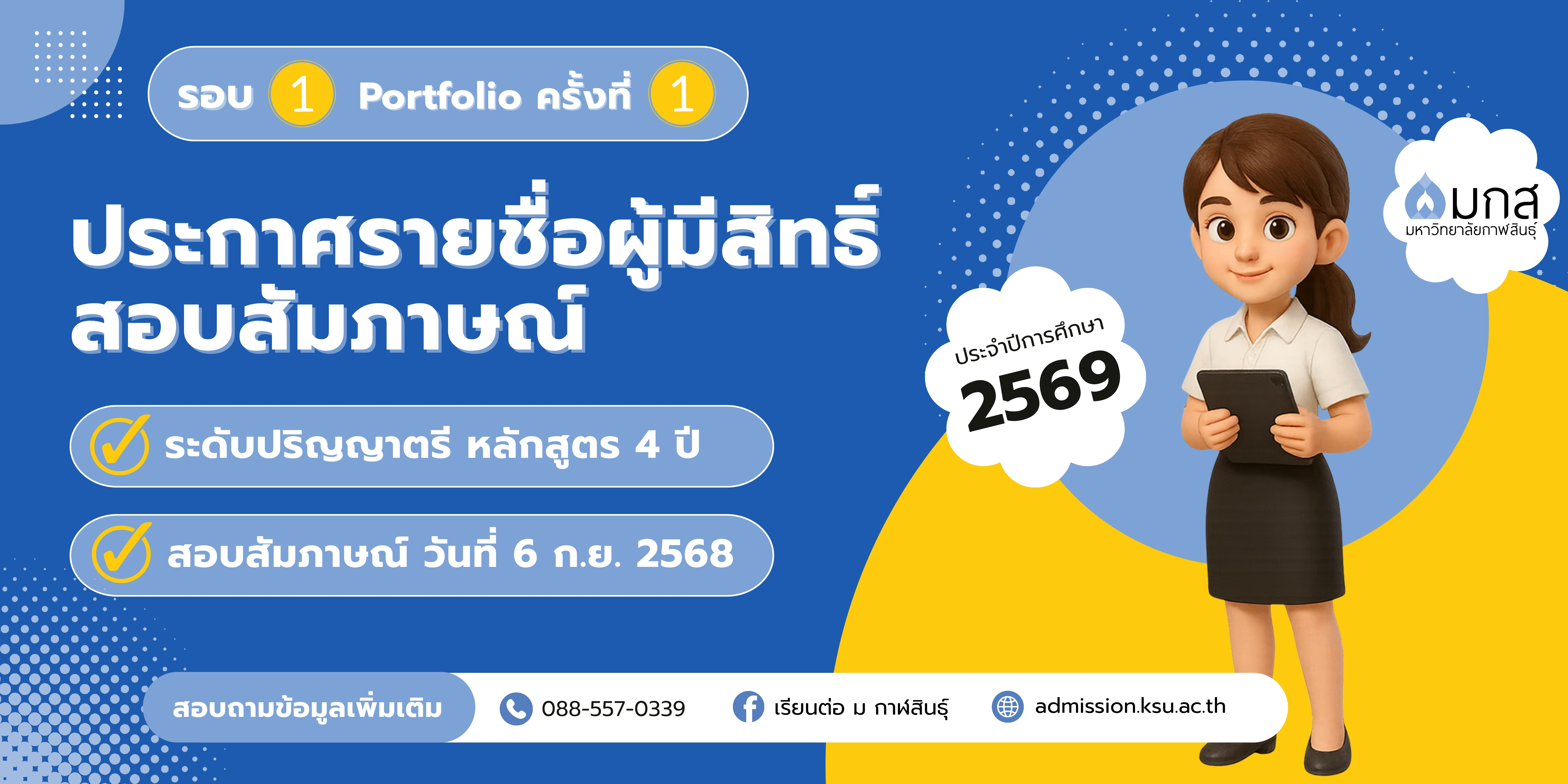 3. ประกาศรายชื่อผู้ผ่านการสัมภาษณ์ ในวันที่ 9 กันยายน 2568 ทางเว็บไซต์ http://admission.ksu.ac.th