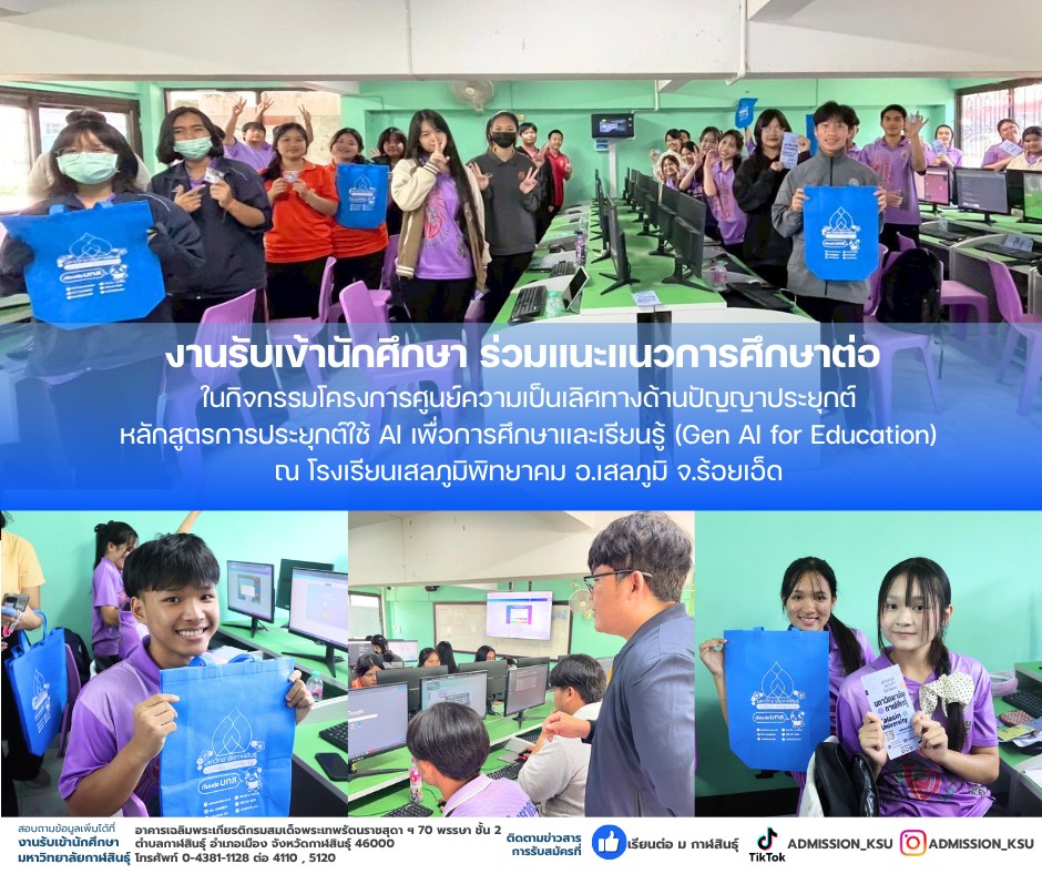วันที่ 29 ก.ค. 68 เยือนถิ่นร้อยเอ็ด โดยในช่วงเช้างานรับเข้านักศึกษา มาพบกับน้องๆ โรงเรียนเสลภูมิพิทยาคม จังหวัดร้อยเอ็ด ภายในโครงการศูนย์ความเป็นเลิศทางด้านปัญญาประยุกต์ หลักสูตรการประยุกต์ใช้ AI เพื่อการศึกษาและเรียนรู้  พี่ๆ งานรับเข้านักศึกษา มาทำความรู้จัก และแนะนำมหาวิทยาลัยกาฬสินธุ์ ให้กับน้อง ๆ หวังเป็นอย่างยิ่งว่าจะได้พบกับน้องๆ รร.เสลภูมิพิทยาคม อีกในโอกาสต่อไปค่ะ  สอบถามเพิ่มเติมที่ inbox เรียนต่อ ม กาฬสินธุ์