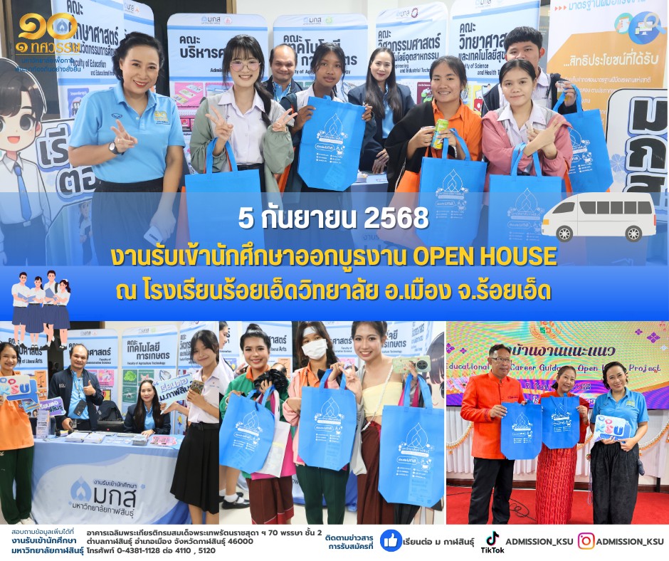 วันที่ 5 กันยายน 2568 งานรับเข้านักศึกษา ร่วมกิจกรรม "เปิดบ้านวิชาการแนะแนว" ประจำปี การศึกษา 2568 ณ โรงเรียนร้อยเอ็ดวิทยาลัย จังหวัดร้อยเอ็ด เพื่อเป็นการแนะแนวเส้นทางการศึกษาต่อให้กับน้องๆ ชั้น ม.ต้น และ ม.ปลาย  ในการนี้ขอบคุณผู้บริหารโรงเรียนร้อยเอ็ดวิทยาลัย ครูแนะแนว และน้องๆ จากโรงเรียนร้อยเอ็ดวิทยาลัย และโรงเรียนในจังหวัดร้อยเอ็ด ที่ร่วมกิจกรรมกับบูธมหาวิทยาลัยกาฬสินธุ์ในครั้งนี้ค่ะ