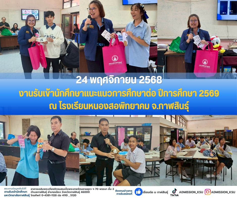 วันที่ 24 พ.ย. 68 งานรับเข้านักศึกษา และอาจารย์จากคณะเทคโนโลยีการเกษตร และคณะบริหารศาสตร์ เข้าแนะแนวการศึกษาต่อ ร.ร. หนองสอพิทยาคม จ.กาฬสินธุ์ ปีนี้ น้องๆ ทุกคนเปี่ยมไปด้วยพลังแห่งความมุ่งมั่นที่จะศึกษาต่อ พี่ๆ งานรับเข้านักศึกษา และอาจารย์จากคณะเทคโนโลยีการเกษตร และคณะบริหารศาสตร์ มาชวนน้องๆ ไปเรียนต่อ ม.กาฬสินธุ์ ไปรับทุนเรียนฟรี 1 ปีการศึกษา