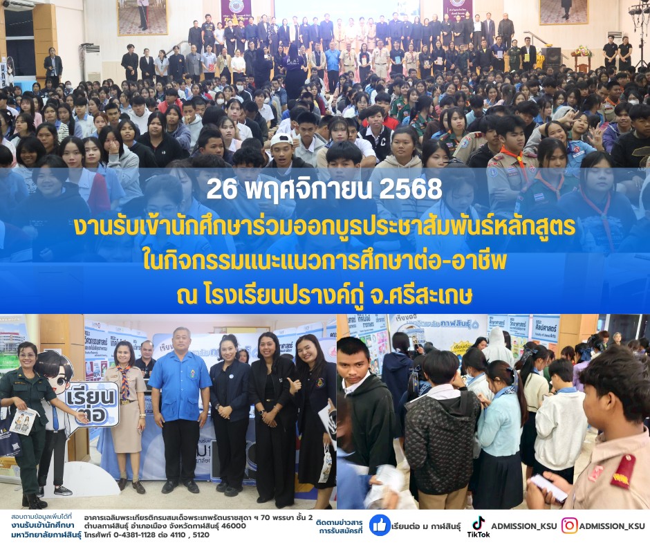 วันที่ 26 พ.ย. 68งานรับเข้านักศึกษา มกส. ได้ร่วมงาน Openhouse งานแนะแนวการศึกษาต่อ-อาชีพ ที่โรงเรียนปรางค์กู่ จัดขึ้น ยิ่งใหญ่เหมือนเช่นเคย ปีนี้มีโรงเรียนและสถาบันศึกษาที่อยู่ในพื้นที่ใกล้เคียงมาร่วมกิจกรรมด้วย น้องๆ ทุกระดับชั้นเข้าเยี่ยมชมในบูธมหาวิทยาลัยกาฬสินธุ์กันอย่างคึกคัก มีของเท่าไหร่ แจกเรียบ น้องๆ ม่วนจอยกันทุกกิจกรรม