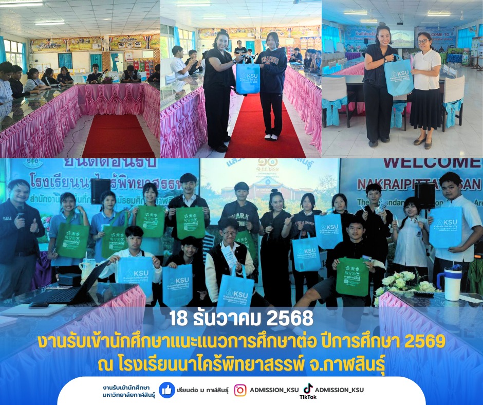 วันที่ 18 ธันวาคม 2568 งานรับเข้านักศึกษา มกส. มาแนะแนวน้องๆ ม.6 โรงเรียนนาไคร้พิทยาสรรพ์ เปิดช่องทางและหลักสูตรจากทั้ง 6 คณะ พร้อมทุนการศึกษา มากกว่า 500 ทุน ที่สำคัญได้ส่งมอบของที่ระลึกให้น้อง KSU11 ที่กำลังจะมาเรียนต่อที่ม.กาฬสินธุ์ด้วย