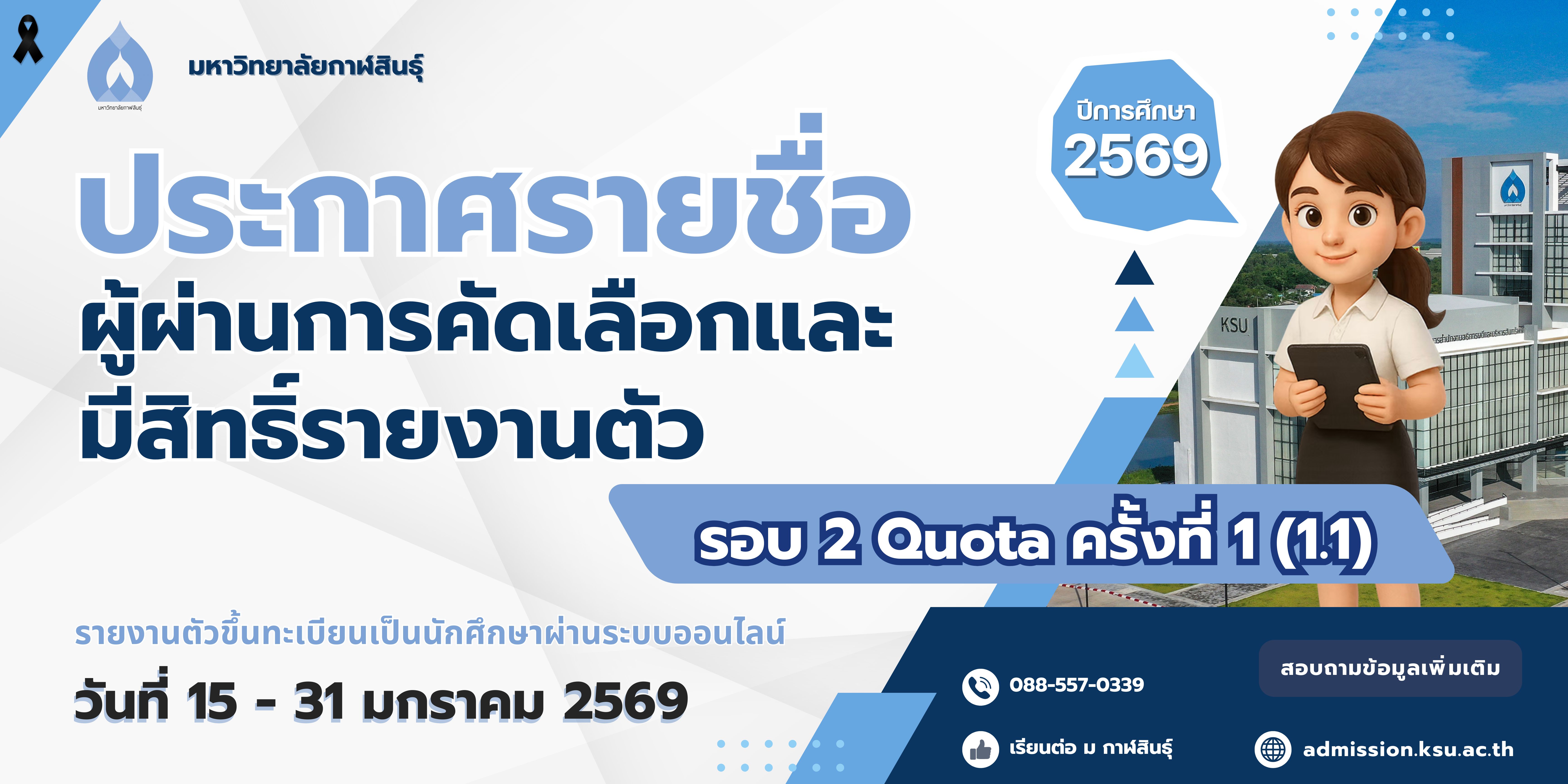 รายงานตัวขึ้นทะเบียนเป็นนักศึกษา ตั้งแต่วันที่ 15 - 31 มกราคม 2569 ทางออนไลน์ ได้ที่ รายงานตัวขึ้นทะเบียนเป็นนักศึกษา คลิกที่นี่