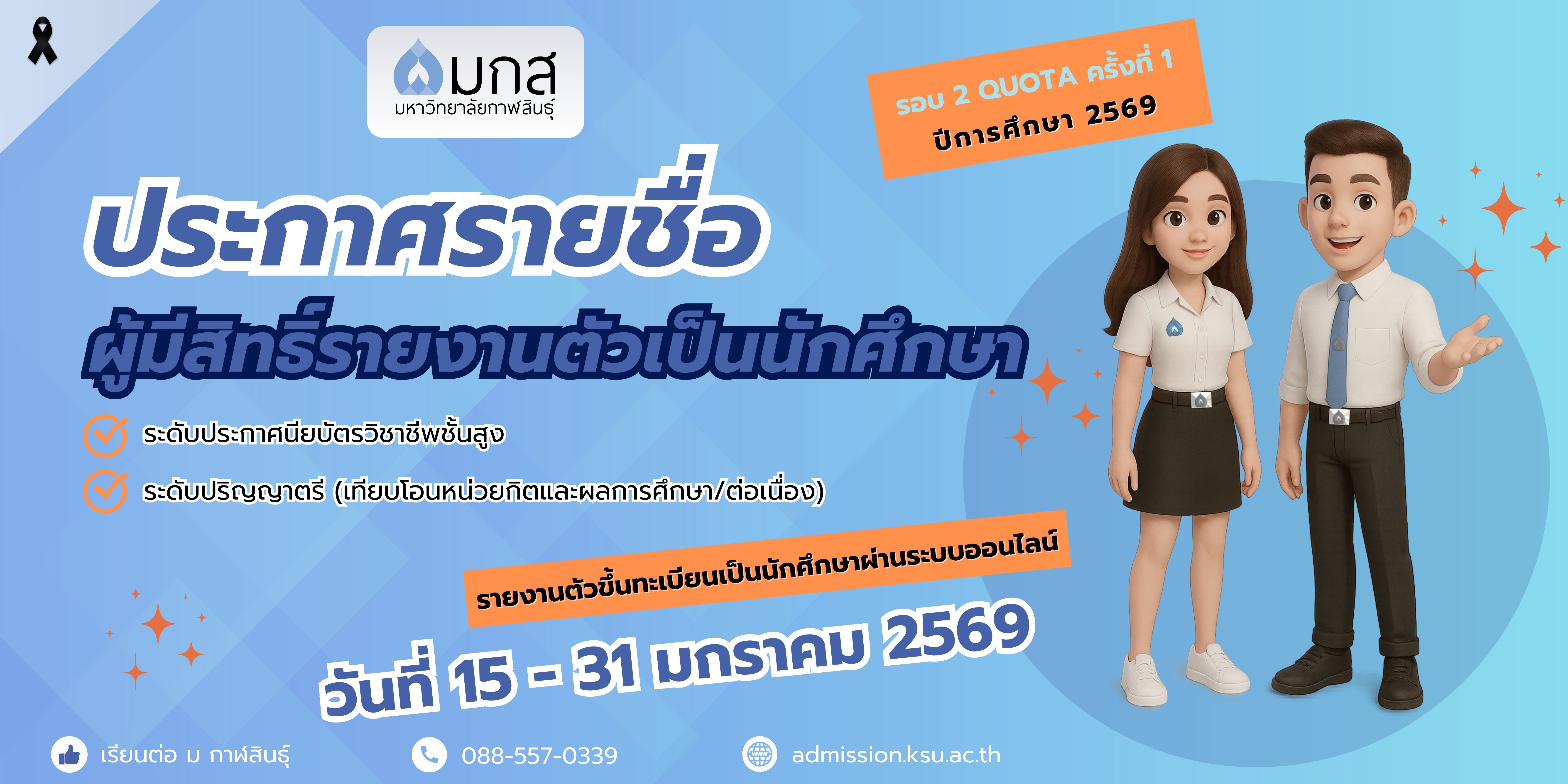 รายงานตัวขึ้นทะเบียนเป็นนักศึกษา ตั้งแต่วันที่ 15 - 31 มกราคม 2569 ทางออนไลน์ ได้ที่ รายงานตัวขึ้นทะเบียนเป็นนักศึกษา คลิกที่นี่